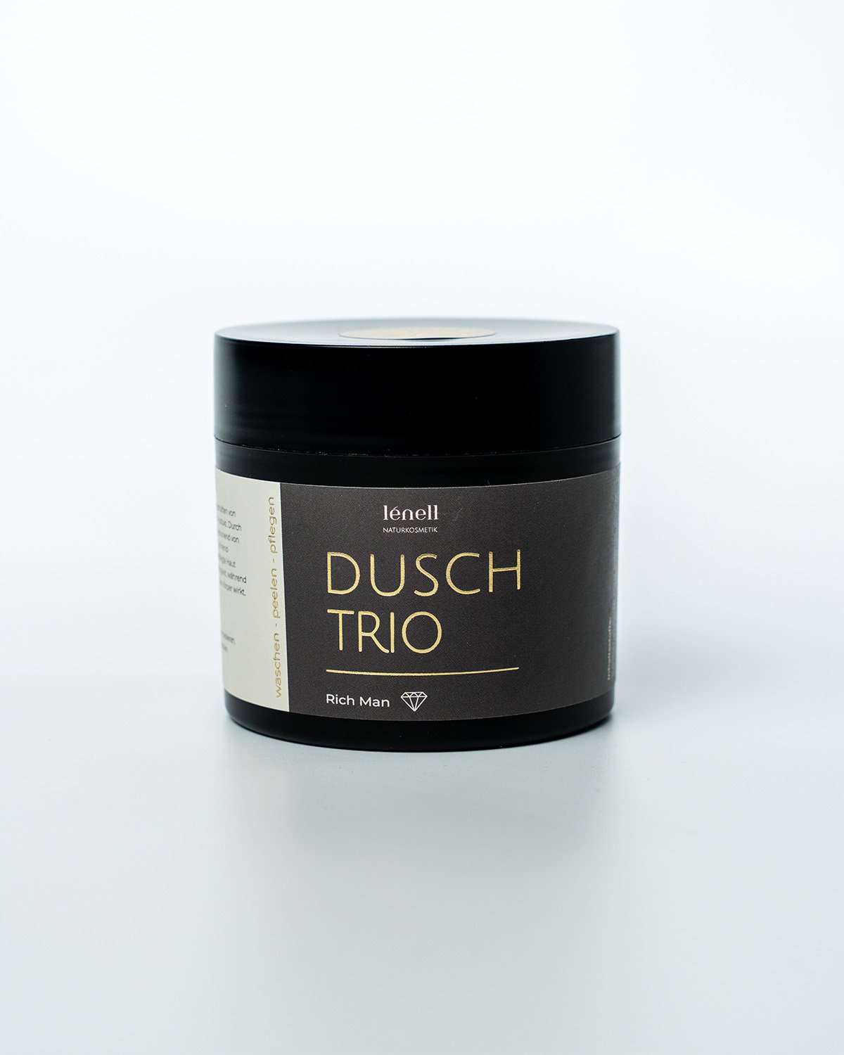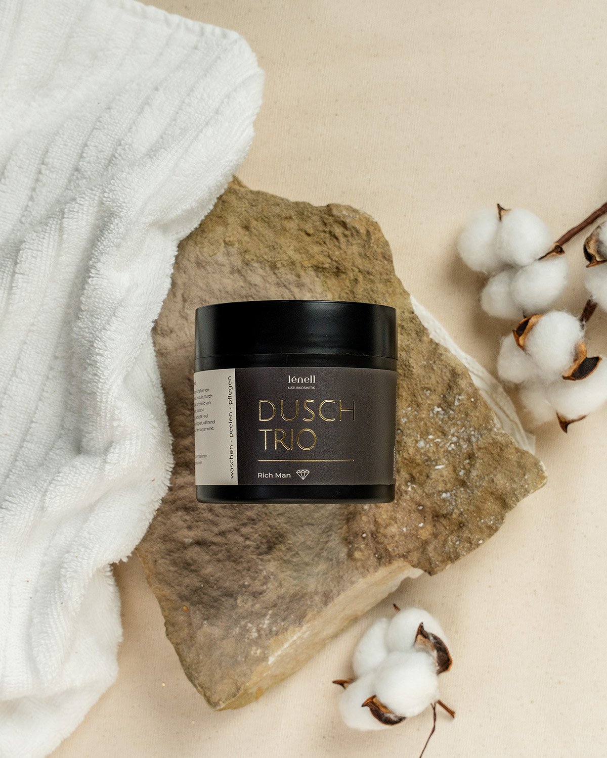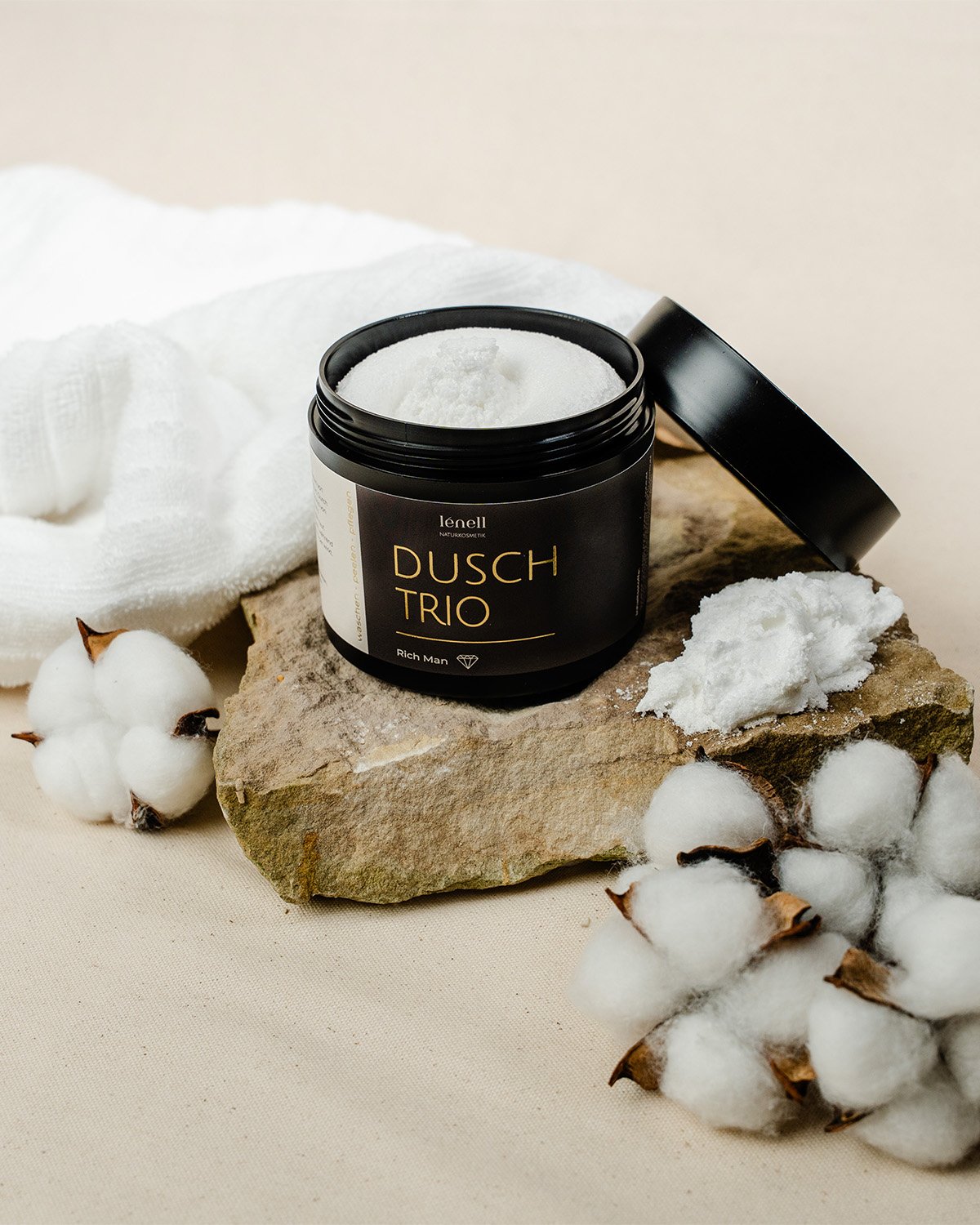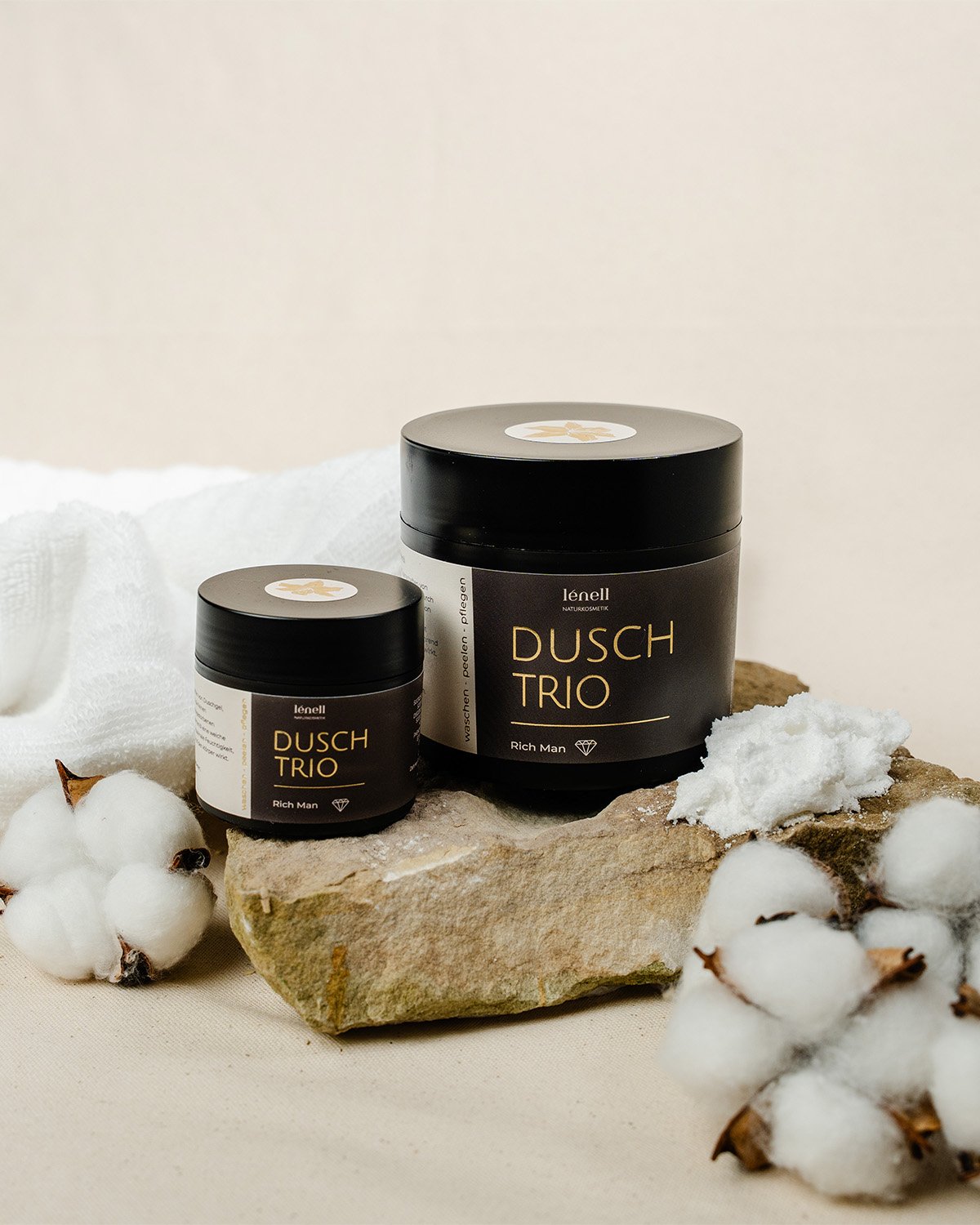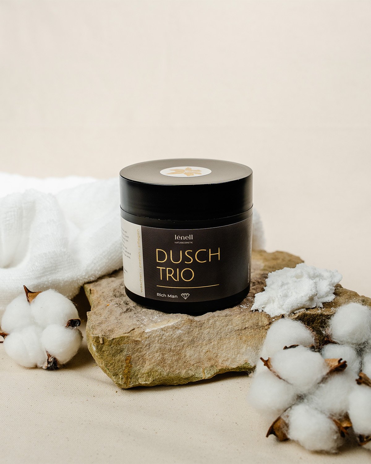 Das Dusch Trio bietet deiner Haut ein umfassendes Verwöhnprogramm. Die Kombination aus Duschgel, Peeling und Lotion sorgt für eine intensive Reinigung und Pflege in einem Schritt. Die pflegenden Inhaltsstoffe verleihen der Haut Geschmeidigkeit und Feuchtigkeit, während die Zellregeneration angeregt wird . Das Ergebnis ist eine glattere Haut mit einem gesunden, strahlenden Glanz. Tauche ein in die Welt der natürlichen Pflege und genieße jeden Moment unter der Dusche.